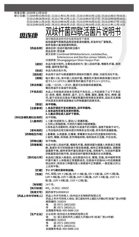 以下為杭州遠(yuǎn)大生物制藥有限公司生產(chǎn)的思連康(雙歧桿菌四聯(lián)活菌片)最新產(chǎn)品說(shuō)明書(shū)2022年12月16日修訂版;