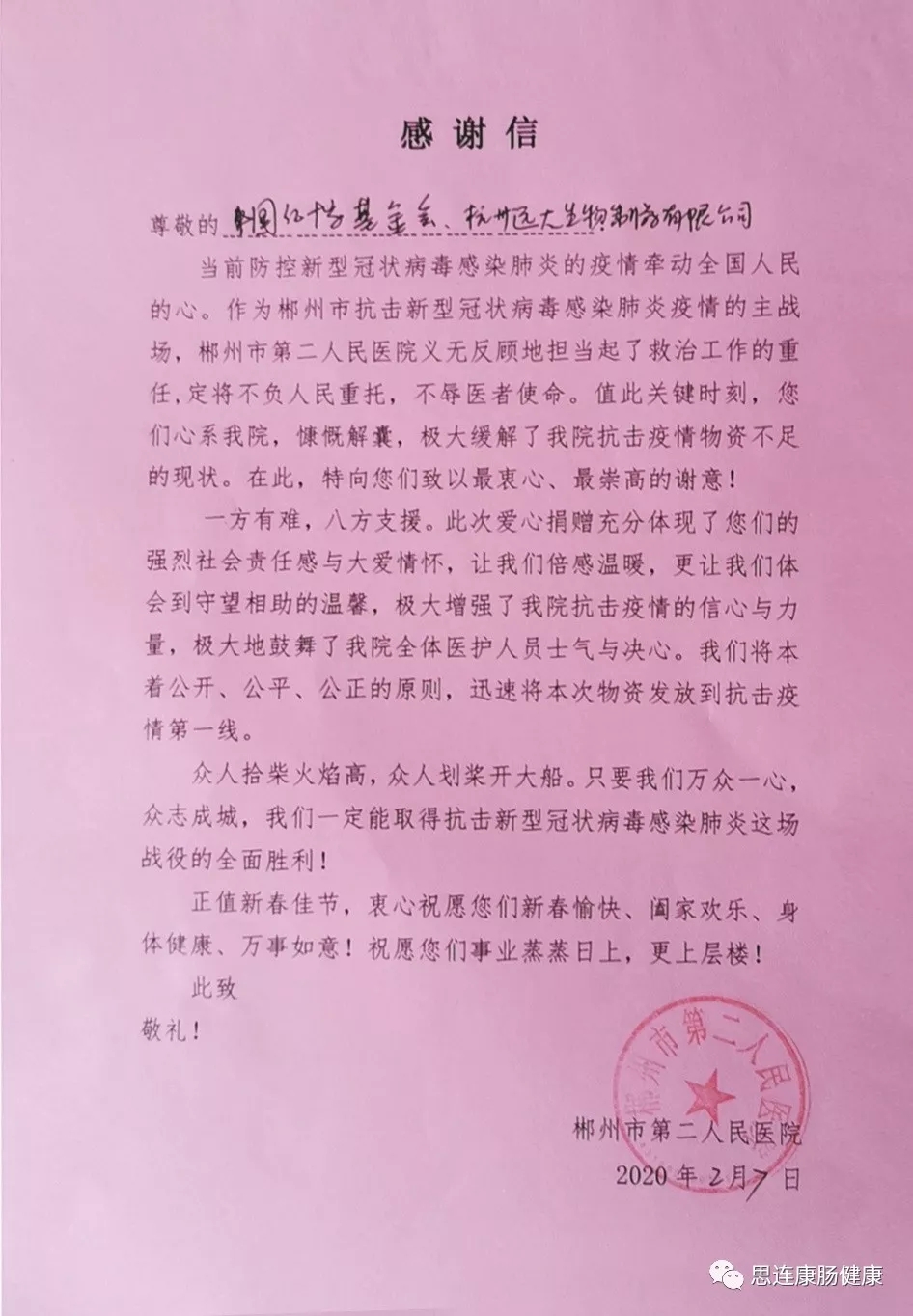 在得知防疫一線急需微生態(tài)藥品后,2020年2月6日,杭州遠大生物制藥有限公司立即啟動捐贈程序,決定第一批捐贈價值100萬元的雙歧桿菌四聯(lián)活菌片(思連康),專項用于疫區(qū)新型冠狀病毒肺炎的防治。目前第一批價值100萬元雙歧桿菌四聯(lián)活菌片(思連康)已全部送達湖北、浙江、湖南等地醫(yī)院;第二批價值130萬元的思連康(雙歧桿菌四聯(lián)活菌片)也已于昨日(2月12日)開始配送醫(yī)院。