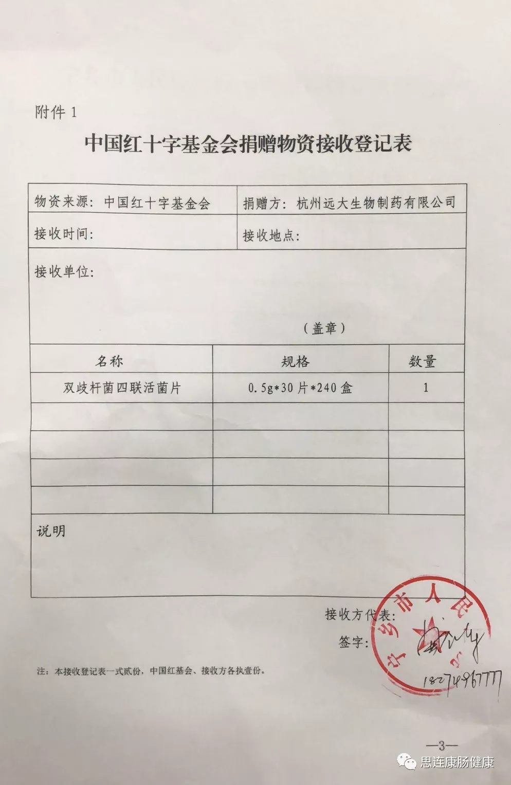 郴州市第二人民醫(yī)院發(fā)來中國紅十字基金會捐贈物資接收登記表確認已經收到捐贈藥品。