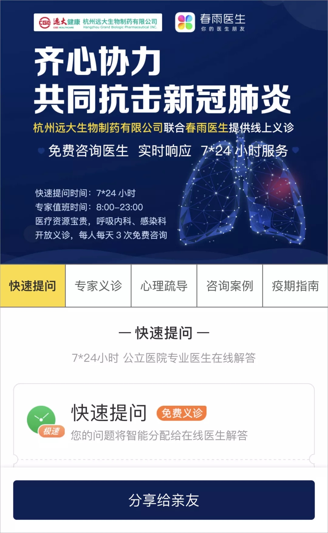 杭州遠大生物制藥有限公司聯(lián)合國內多家知名醫(yī)療在線垂直領域問診平臺春雨醫(yī)生、快速問醫(yī)生、妙手醫(yī)生共同發(fā)起免費在線義診活動