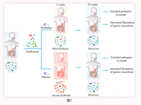 結(jié)果顯示: 思連康雙歧桿菌四聯(lián)活菌片組胃腸道不良反應(yīng)發(fā)生率低于安慰劑組(23.6% vs 37.7%,p =0.016)。除此之外,在根除后,腸道菌群結(jié)構(gòu)發(fā)生了劇烈的變化,變形菌門取代了共生厚壁菌門和擬桿菌門,并在兩周后逐漸恢復(fù)。補(bǔ)充思連康雙歧桿菌四聯(lián)活菌片可中和根除藥物所帶來(lái)的腸道擬桿菌門的減少,使胃菌群的波動(dòng)更加平穩(wěn),抑制口腔致病菌的生長(zhǎng)。 01思連康減少Hp根除后不良反應(yīng) 與安慰劑組相比,雙歧桿菌四聯(lián)活菌片組胃腸道不良反應(yīng)的總體發(fā)生率顯著降低(23.62% vs 37.7%,p =0.016),且安慰劑組惡心嘔吐發(fā)生率高于雙歧桿菌四聯(lián)活菌片組(24.59% vs 13.39% ,p =0.024)(圖1)。 02思連康緩解Hp根除后的腸道菌群紊亂 03思連康可使Hp根除后胃菌群波動(dòng)減小 04思連康可抑制Hp根除后口腔致病菌生長(zhǎng) 越來(lái)越多的證據(jù)提示,根除幽門螺桿菌感染的鉍劑四聯(lián)療法會(huì)導(dǎo)致腸道菌群穩(wěn)態(tài)的短期受損。《第六次全國(guó)幽門螺桿菌感染處理共識(shí)報(bào)告》明確指出,根除治療可改變腸道微生物種群的多樣性和結(jié)構(gòu)。 本次研究顯示: 頓服思連康雙歧桿菌四聯(lián)活菌片,可降低胃腸道不良反應(yīng)的發(fā)生率。 根除幽門螺桿菌后,唾液、胃和腸道的微生物菌群組成發(fā)生顯著變化,停用抗生素兩周后腸道菌群恢復(fù)到基線水平。通過頓服思連康雙歧桿菌四聯(lián)活菌片治療,可使微生物菌群的紊亂得到緩解(圖7)。這為幽門螺桿菌治療方案的進(jìn)一步優(yōu)化以及副作用的減輕提供了新的臨床應(yīng)用方向和思路。 [1] YUAN Z, XIAO S, LI S, et al. The impact of Helicobacter pylori infection, eradication therapy, and probiotics intervention on gastric microbiota in young adults [J]. Helicobacter, 2021, 26(6): e12848. [2] SALAMA N R, HARTUNG M L, MüLLER A. Life in the human stomach: persistence strategies of the bacterial pathogen Helicobacter pylori [J]. Nature reviews Microbiology, 2013, 11(6): 385-99. [3] BANG C S, LIM H, JEONG H M, et al. Amoxicillin or tetracycline in bismuth-containing quadruple therapy as first-line treatment for Helicobacter pylori infection [J]. Gut microbes, 2020, 11(5): 1314-23. [4] YE Q, SHAO X, SHEN R, et al. Changes in the human gut microbiota composition caused by Helicobacter pylori eradication therapy: A systematic review and meta-analysis [J]. Helicobacter, 2020, 25(4): e12713. [5] CHEN C C, LIOU J M, LEE Y C, et al. The interplay between Helicobacter pylori and gastrointestinal microbiota [J]. Gut microbes, 2021, 13(1): 1-22. [6] ZHAO Y, YANG Y, ARUNA, et al. Saccharomyces boulardii Combined With Quadruple Therapy for Helicobacter pylori Eradication Decreased the Duration and Severity of Diarrhea: A Multi-Center Prospective Randomized Controlled Trial [J]. Frontiers in medicine, 2021, 8: 776955. [7] PLOMER M, III PEREZ M, GREIFENBERG D M. Effect of Bacillus clausii Capsules in Reducing Adverse Effects Associated with Helicobacter pylori Eradication Therapy: A Randomized, Double-Blind, Controlled Trial [J]. Infectious diseases and therapy, 2020, 9(4): 867-78. [8] YANG C, LIANG L, LV P, et al. Effects of non-viable Lactobacillus reuteri combining with 14-day standard triple therapy on Helicobacter pylori eradication: A randomized double-blind placebo-controlled trial [J]. Helicobacter, 2021, 26(6): e12856. [9]《第六次全國(guó)幽門螺桿菌感染處理共識(shí)報(bào)告》
