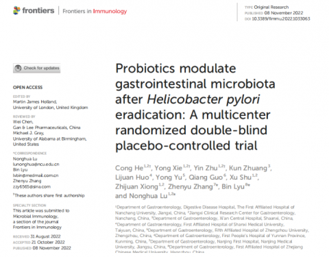 南昌大學(xué)第一附屬醫(yī)院呂農(nóng)華教授牽頭,包括西安市中心醫(yī)院、山西醫(yī)科大學(xué)第一附屬醫(yī)院、鄭州大學(xué)第五附屬醫(yī)院、云南省第一人民醫(yī)院、南京醫(yī)科大學(xué)附屬南京醫(yī)院及浙江中醫(yī)藥大學(xué)第一附屬醫(yī)院在內(nèi)的全國(guó)七家三甲醫(yī)院共同開展了一項(xiàng)為期兩年八個(gè)月的多中心、隨機(jī)、雙盲、安慰劑對(duì)照研究,并在2022年11月Frontiers in Immunology(IF:8.786)發(fā)表了題為”Probiotics modulate gastrintestinal microbiota after Helicobacter pylori eradication:A multicenter randomized double-blind placebo-controlled trial”的研究論文。旨在進(jìn)一步明確思連康雙歧桿菌四聯(lián)活菌片聯(lián)合14天含鉍劑四聯(lián)療法根除幽門螺桿菌的療效和安全性,以及對(duì)胃腸道菌群變化的影響。